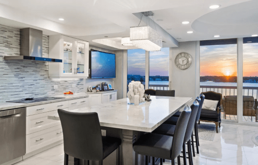 Dr. Michael and Grace Khalife’s sleekly updated condominium in Sloan’s Curve captures dramatic sunset vistas over the Intracoastal Waterway as well northeast views of the Atlantic.